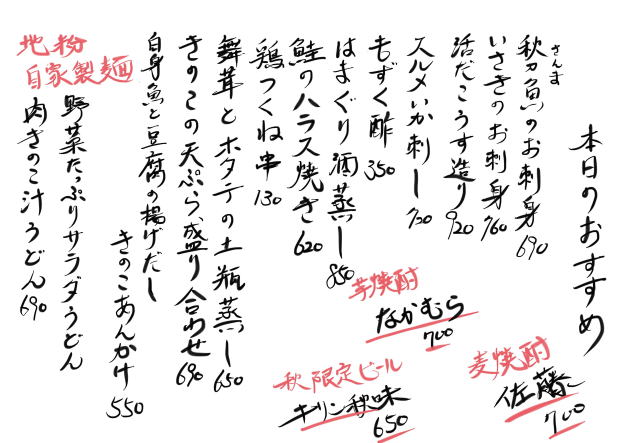 わごころでは、お客様に美味しいものを、美味しい時期に食べて頂けるよう努力していますので、仕入れにより、毎日おすすめメニューが変わることがあります。なにとぞご了承くださいませ。